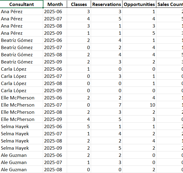 Per-Consultant Summary (Sales, Points, Classes, Reservations, Opportunities)