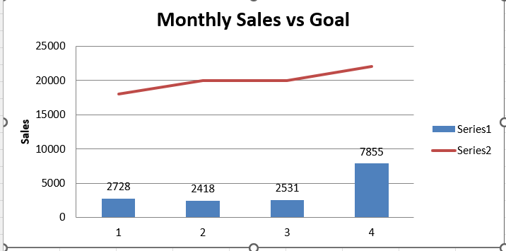 Monthly Sales vs. Goals — visualized in clear red vs. blue comparisons.