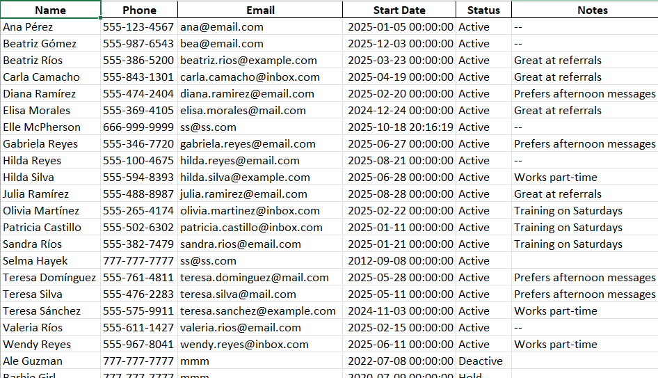 Your centralized roster for every team member. It standardizes contact info, start dates, status, and coaching notes so nothing gets lost. With realistic demo data baked in, you can immediately sort by Active vs Inactive, filter by tenure, and spot who needs outreach, turning people management into a quick, confident scan.