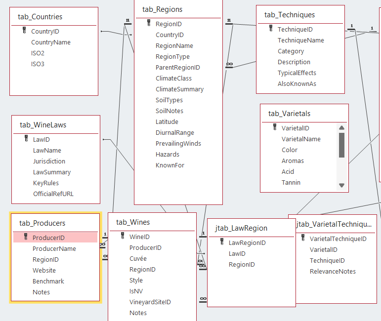 Beneath the surface lies a carefully engineered relational structure that mirrors the way wine actually works in the real world: countries contain regions, which contain producers, which create wines from specific varietals using defined techniques. These relationships maintain data integrity and make exploration natural — change a law, and every related region updates automatically. This interconnected design turns the database into more than just a tool; it’s a living map of the wine world, capable of revealing patterns and hierarchies that traditional notes could never show.